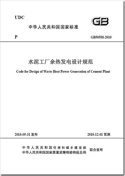 中華人民共和國住房和城鄉(xiāng)建設部發(fā)布第638號公告,由中國水泥協(xié)會、中材節(jié)能發(fā)展有限公司主編的國家標準《水泥工廠余熱發(fā)電設計規(guī)范》,自2010年12月1日起實施,標準編號GB50588-2010(http://www.csres.com/notice/38848.html)。