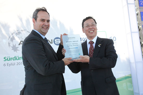 土耳其Akcansa水泥集團(tuán)總經(jīng)理(左)向中材節(jié)能總經(jīng)理胡也明授牌